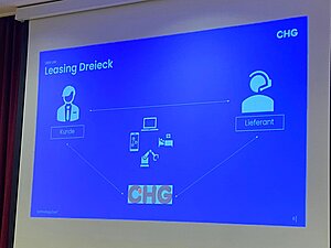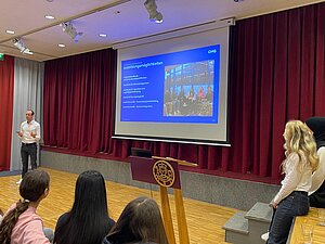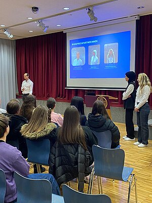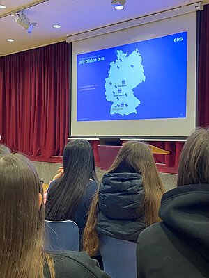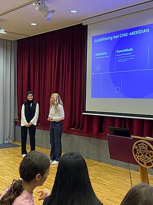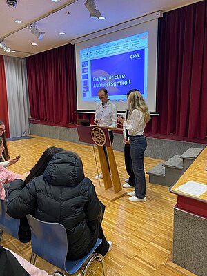 Herr Christian Woesch, Education & Study Coordinator/People & Culture Business Partner CHG-MERIDIAN AG, informierte am 26. Januar die Schüler*innen der Klassen 9 im Saal der Grund- und Werkrealschule zusammen mit den Auszubildenden Frau Aileen Ritter und Frau Melissa Schauermann über das Ausbildungsangebot bei CHG.