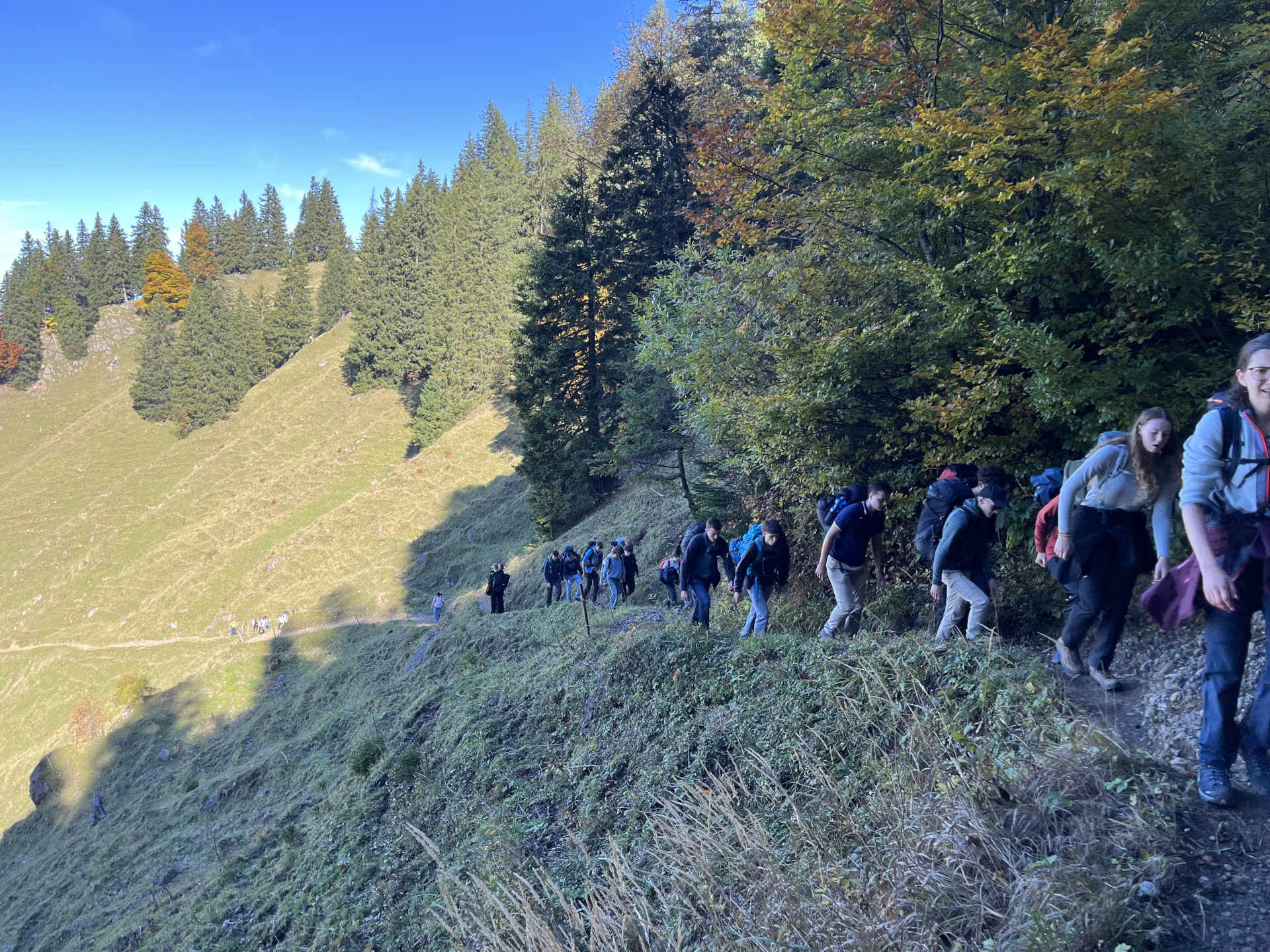 Gleichzeitig war die Fahrt Teil des Philosophisch-Theologischen Forums (PTF). Im Rahmen des Seminars setzten sich die Schülerinnen und Schüler intensiv mit moralischen und ethischen Fragen auseinander: Utilitarismus, Kant und Rawls standen auf dem Stundenplan, Diskussionen und Reflexionen folgten auf die körperliche Herausforderung des Aufstiegs. Besonders wertvoll war, dass die Kursstufe an diesen Tagen erstmals als ganze Gruppe zusammenkam – mit sichtbarer Freude am gemeinsamen Lernen, aber auch beim Kartenspiel zwischendurch. So verband die Fahrt Anstrengung, intellektuelle Arbeit und Gemeinschaftserlebnis auf einzigartige Weise. Hochzufrieden und müde stiegen alle mittags wieder ab, bereichert um neue Einsichten und gemeinsame Erinnerungen.