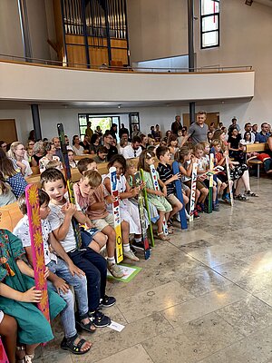 Unter dem Thema „Beschirmt, beschützt in Gottes Hand“ zogen die Büchertaschenkinder aller Gruppen begleitet von Harfenklängen in die Kirche ein. Mit dem Lied „Das ist toll, dass ihr da seid“ stimmten wir uns ein und Herr Schindler führte uns durch den Gottesdienst. Dabei sprachen die ältesten Kinder der Gruppen 3 und 4 das Kyrie und die Fürbitten. Statt der Predigt zeigten die ältesten Kinder der Gruppen 1 und 2, unter was die Kinder Schutz finden: einem Regenschirm, einem Sonnenschirm, bei den Freunden, der Familie und in dem Kindergarten & der Schule. Dazu passend stimmten wir das Lied „Beschirmt, beschützt in deiner Hand“ an. Außerdem wurden die Holzkreuze an Lederbändern mit Weihwasser geweiht. Als sich alle Büchertaschenkinder im Halbkreis im Altarraum versammelten, erklang die Harfe und jedes Kind, das in die Schule kommt, bekam mit persönlichen Worten den Segen Gottes auf seinem Weg zugesprochen. Nach dem Vater unser und der Segensbitte sangen wir gemeinsam „Mögen Engel dich begleiten“.